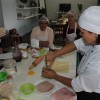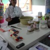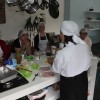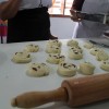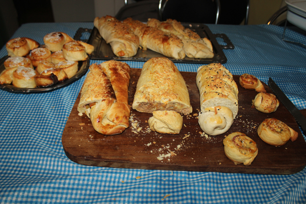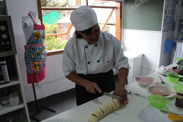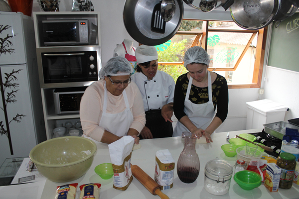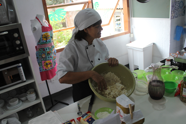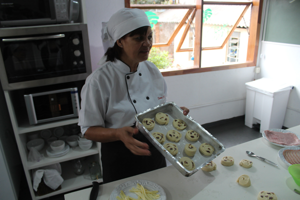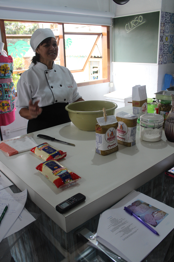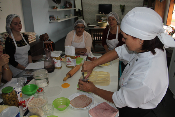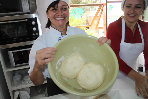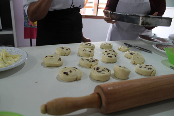 Para o recheio do pão básico na aula foram utilizados aliche e queijo para um delicioso pão salgado cortado em formato de caracóis. Outra opção foi o pão doce, também cortado em formato de caracol, feito com coco ralado, leite condensado e frutas cristalizadas.