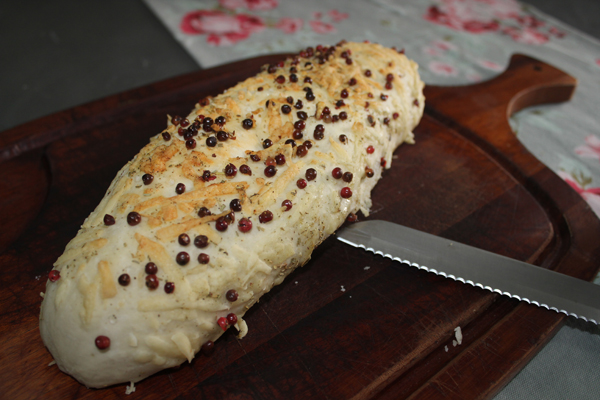 O pão subway com cobertura de mussarela ralada e pimenta rosa consegue um delicioso sabor. Outro preparo foi com recheio de mussarela e peito de peru, enrolado como rocambole.