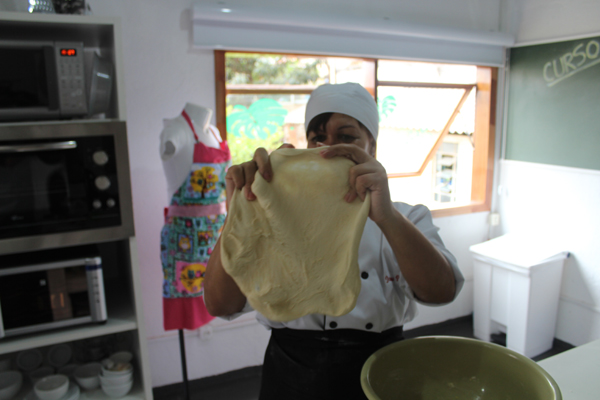 Ponto de véu de glúten – para saber se a massa está no ponto ideal, estique um pedaço na mão, se formar um véu, uma película fina com uma camada só, e que, quando se rompe não quebra numa linha reta, a massa está pronta. (Foto: Marcos Garcia)