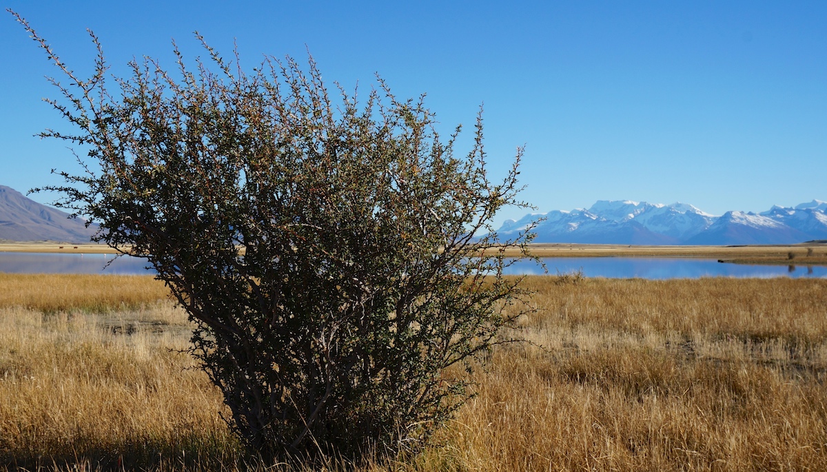 Calafate (Berberis microphylla) é um arbusto espinhoso, perene, rústico e de formas interessantes. Produz uma frutinha roxa deliciosa com a qual se faz geléias, sorvetes, licores e até cerveja. Figurinha fácil na paisagem das estepes patagônicas, é ele que dá o nome à esta simpática cidadezinha na Patagonia Argentina.