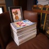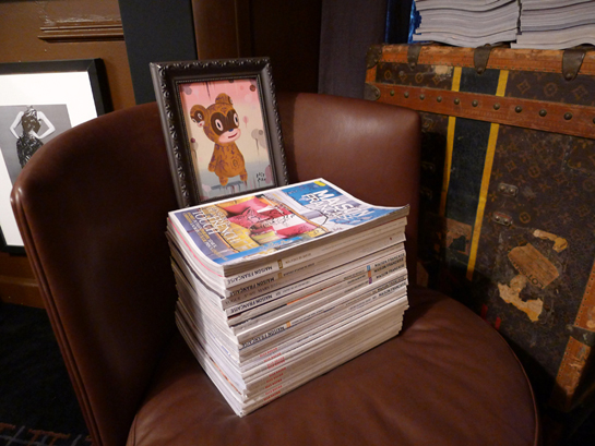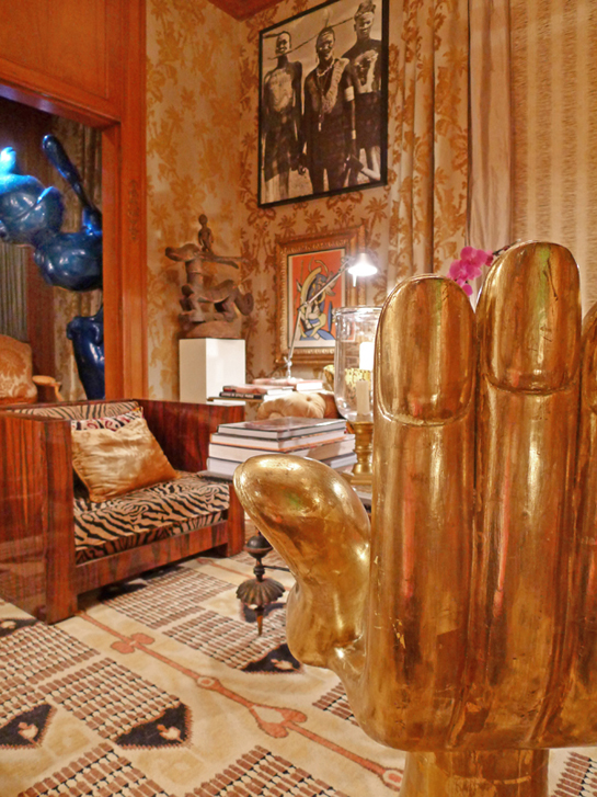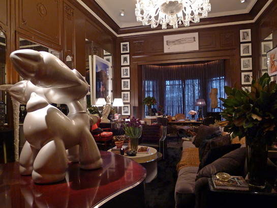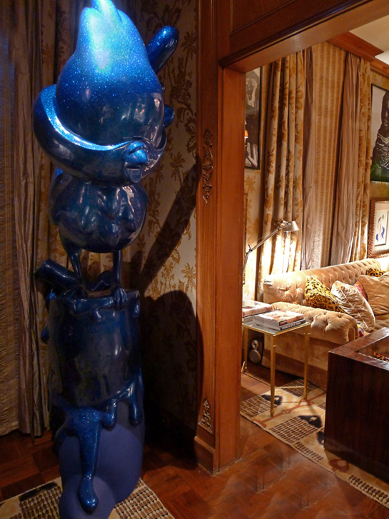 Jorge Elias fez da biblioteca uma galeria-síntese de diversos movimentos artísticos, dos séculos 18 ao 21. Em projeto autoral, a partir da estrutura clássica, ali se expõem genuínos móveis Art Déco, Picasso, Chagall e Botero. Mais um toy by Degaki e fotografias de Steven Meisel e Bruce Weber contribuem para o refinado intimismo do ambiente.