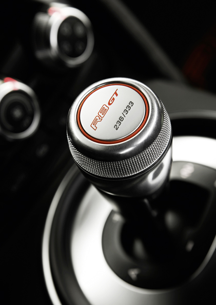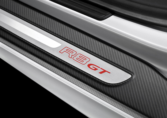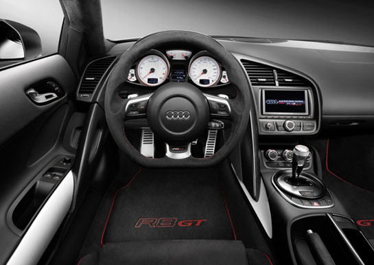 Até o para-brisa do R8 GT é mais fino. Policarbonato foi aplicado na separação do habitáculo e do compartimento do motor, bem como na sua cobertura, feita com fibra de carbono reforçada com plástico. O sistema de freio de carbono/cerâmica também foi aliviado, bem como detalhes como o coletor de admissão e isolação do motor, até tapeçaria. Cada peça foi devidamente analisada e criteriosamente trabalhada, visando além da redução de peso, maior resistência ao desgaste.
