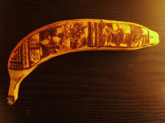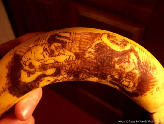 O artista australiano Jun Gil Park buscou inovar no material usado para suas criações. Como matéria-prima ele utiliza apenas um palito de dentes e uma banana como tela. Por conta da oxidação da casca da banana quando arranhada, a fruta se tornou o lugar ideal para a criação diferenciada do artista.