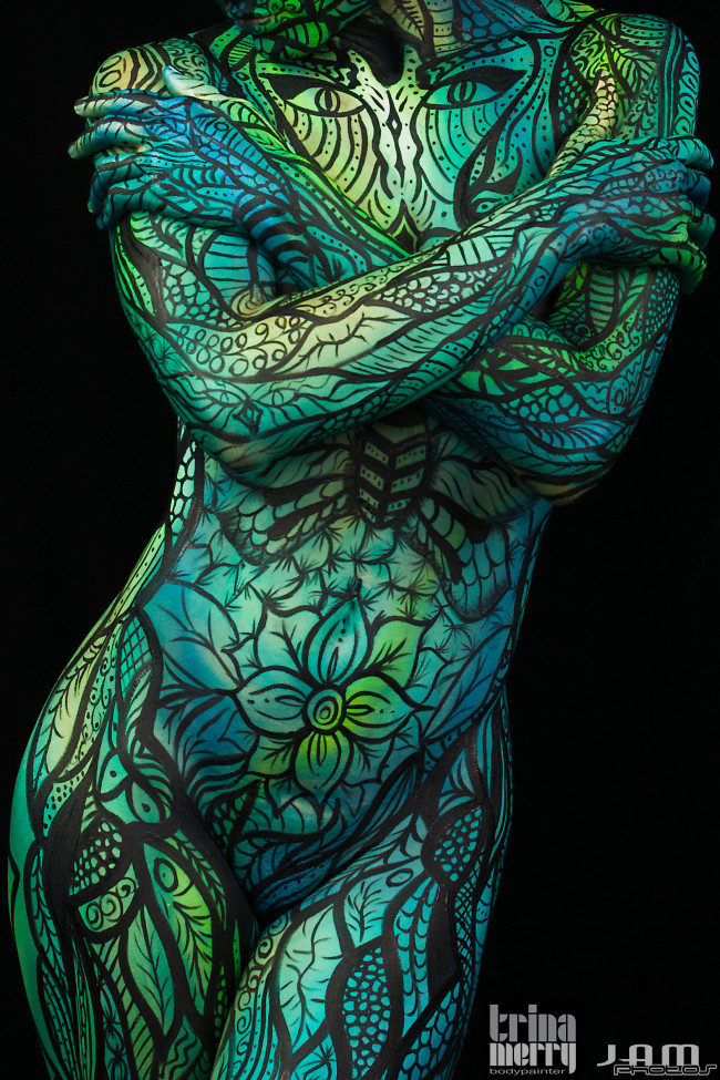Trina Merry vive e respira “os seres humanos”, tornando este um meio altamente relevante e imediato. Utiliza tinta hipoalergênica – não-tóxica – aplicada com pincel ou aerógrafo.