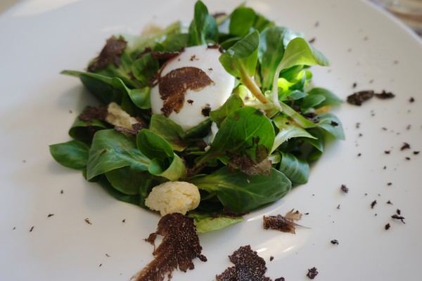 – Salada de baby rúcula com ovo pouchet, lascas de trufas negras e um molhinho delicioso;
