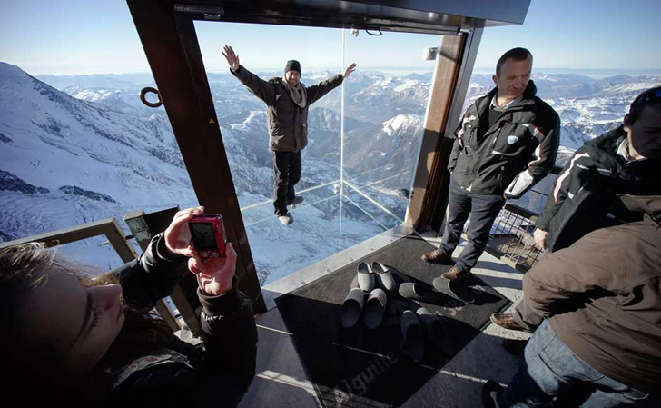 No topo do pico da montanha Aiguille du Midi, no alto dos Alpes franceses, você pode encontrar uma caixa de vidro especialmente projetada, chamada de Chamonix Skywalk. Inspirado em uma passarela de vidro do Grand Canyon, a estrutura é feita a partir de 12 milímetros de vidro temperado e foi instalada a 1.035 metros (3.396 pés) acima do vale, permitindo aos visitantes a sair e enfrentar seus medos nas alturas. Não só a queda é bastante grave, mas os ventos naquela altura são muito fortes, tornando esta uma tarefa difícil para os mais destemidos escaladores. A passarela foi aberta ao público no dia 21 de dezembro de 2013 e já teve até pedido de casamento no local! Deve ser realmente inspirador!