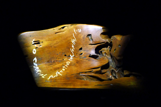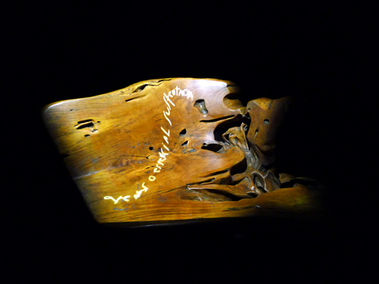 Uma sala negra onde domina um banco de pequi criado por Hugo França, presença que encampa a natureza e, hipnotizante, já seria digno de contemplação. Mas no espaço conceitual que propõe na Hyundai Mostra Black, a arquiteta Renata Seripieri criativamente utiliza a peça como tela para frases que surgem dos orifícios naturais da madeira, percorrem a superfície e encontram outras cavidades para se esconder (resultado de estudo do movimento real de uma cobra e um software desenvolvido para simulá-lo).