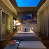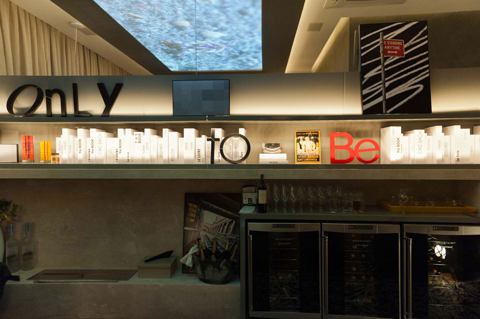 O painel de 2,70m X 4,30m instalado no teto exibe diversas projeções de imagens românticas. Para elaborar este projeto inédito, a Taag fez um estudo analítico de angulação de telas para que a imagem se propagasse em toda a superfície exibindo diferentes cenas. Com o objetivo de oferecer a sensação de amplitude, o painel se estende por todo o espaço e é refletido pelo espelho acima da estante cinza, que dispõe livros, três adegas da Brastemp e uma lareira ecológica de 90 cm.