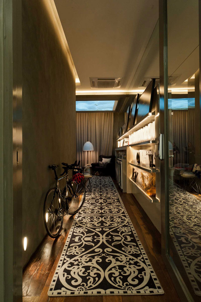 Quem entra logo é seduzido por belas peças de design, escolhidas para traduzir a personalidade arrojada do morador. A passadeira assinada pelo holandês Marcel Wanders leva direto para uma confortável poltrona Cloudscape, feita para a marca em parceria com a italiana Moroso. Ao lado dele, mesinhas dos franceses Ronan e Erwan Bouroullec, outros nomes fortes do design atual. Para aguçar os sentidos, as arquitetas criaram um jardim vertical integrado a um armário automatizado. Imagens projetadas no teto e iluminação dimerizada ajudam a criar um clima intimista.