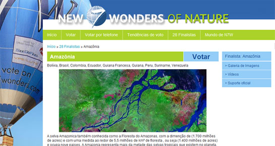 A Floresta Amazônica, presente no Brasil, Peru, Colômbia, Equador, Guiana Francesa, Guiana, Suriname e Venezuela, concorre ao título de uma das sete novas maravilhas do mundo. A votação termina amanhã, mas ainda há tempo de dar sua opinião. Basta acessar o site www.new7wonders.com.