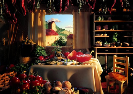 O mais sensacional é a variedade dos materiais utilizados pelo artista na criação de suas obras: verduras, pães, presunto, frutas e tudo pode se tornar uma bela paisagem.