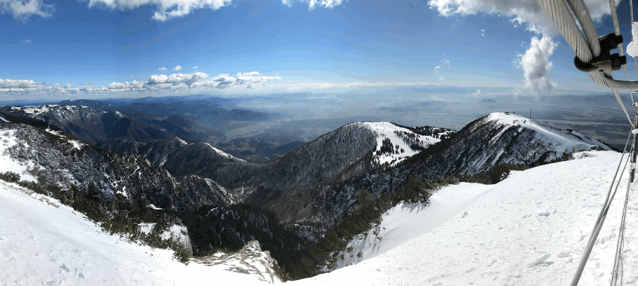 O ponto mais alto de Krvavec atende pelo nome de Veliki Zvoh — uma imponente elevação de 1.971 metros que parece tocar o céu. O teleférico chega quase lá, mas não completamente. Faltando apenas alguns metros, é preciso subir a pé. E vale cada passo. Do topo, a vista se abre em um espetáculo de montanhas — a cordilheira se estende como uma pintura viva, revelando uma parte dos majestosos Alpes Julianos. É aquele tipo de cenário que silencia a mente e preenche o corpo com a sensação exata de estar no lugar certo, na hora certa.