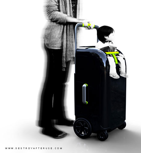 O modelo STROLLN é uma grande mala que possui uma espécie de banco na parte superior para a acomodação uma criança pequena.