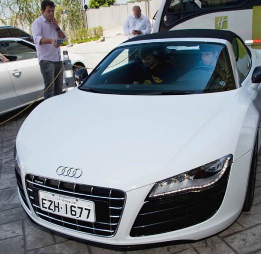 O Salão do Automóvel 2012 será aberto ao público na próxima quarta-feira (24), mas a programação já começou nesta segunda-feira para a imprensa. Uma das atrações da manhã de hoje foi a visita do ídolo Neymar ao Anhembi. Após cumprir com os seus compromissos, o jogador passou em frente aos carros da Audi disponíveis para test-drive – R8 GT Spyder, R8 Spyder, S5 Cabriolet e Audi TTS, e questionou se poderia ir até Santos, cidade onde vive, dirigindo o R8 Spyder. O pedido foi aceito e o jogador partiu para o litoral a bordo desse superesportivo de luxo.