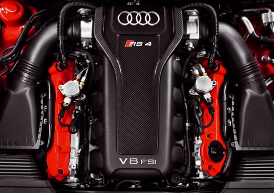 Cheia de estilo, com os dois cabeçotes dos cilindros pintado em vermelho, o motor V8 (o mesmo que equipa o RS5 Coupé) tem torque máximo de 430 Nm, disponível de 4.000 a 6.000 rpm. As respostas são extremamente rápidas: a RS4 Avant acelera de 0 a 100 km/h em apenas 4,7 segundos, número ainda melhor do que o da versão anterior, que chegava a 100 km/h em 4,9 segundos com um motor de 420 cv – 30 a menos que a versão atual. A velocidade máxima é limitada de 250 km/hora, mas pode chegar a 280 km/h se requisitado.