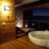 Quanto a nossa super suíte, uma piscina triangular aquecida, sauna seca, banheira de hidromassagem, espreguiçadeiras internas e externas, sala de estar com lareira, copa e uma pequena adega.