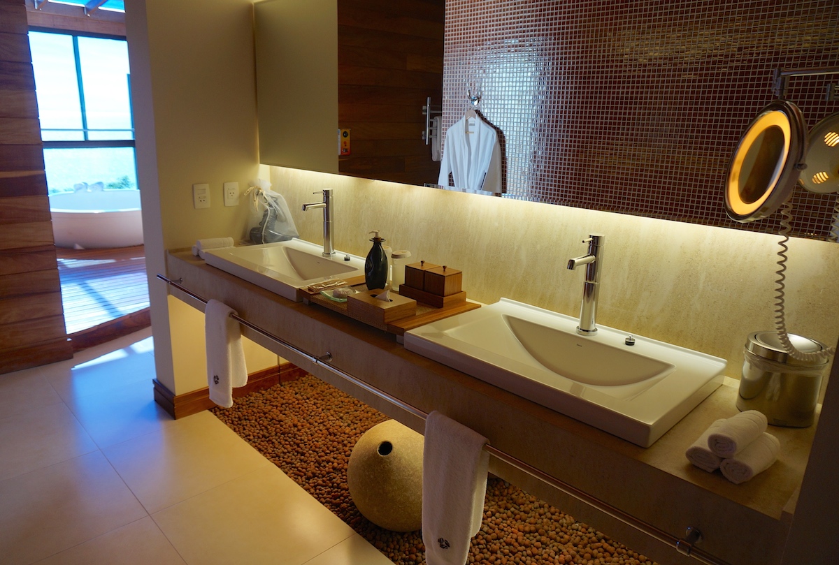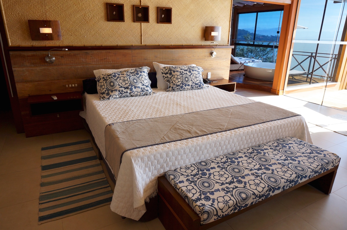 Com 25 bangalôs divido em 4 categorias, Ponta dos Ganchos, oferece muito conforto e sofisticação nos bungalows. Nós ficamos no esmeralda, a ala mais nova do resort e simplesmente espetacular. Nosso quarto tinha 230m2 com piscina privativa aquecida, deck, jacuzzi, sauna seca, home theater, lareira, adega, frigobar, mini copa, banheiro duplo. A ala esmeralda e vila ainda apresentam as suítes especiais maiores ainda e com academia privativa.