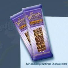 O Scrumdiddlyumptious é uma barra de chocolate ao leite com caramelo, biscoito e amendoim crocante.