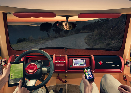 A grade externa frontal é, na verdade, um gadget. O sistema oferece acesso à Internet e a serviços, como o de redes sociais. Além disso, as cores variam de acordo com o estado emocional do motorista: verde significa tranquilo; azul, alegria; e laranja, estresse. O painel conta com tapetes de palha, bancos decorados e encaixes perfeitos para computadores portáveis, inclusive tablets.