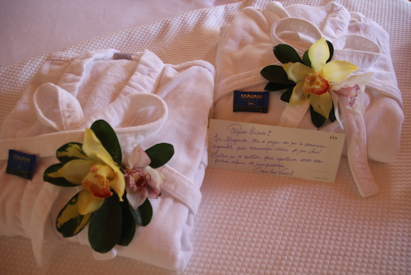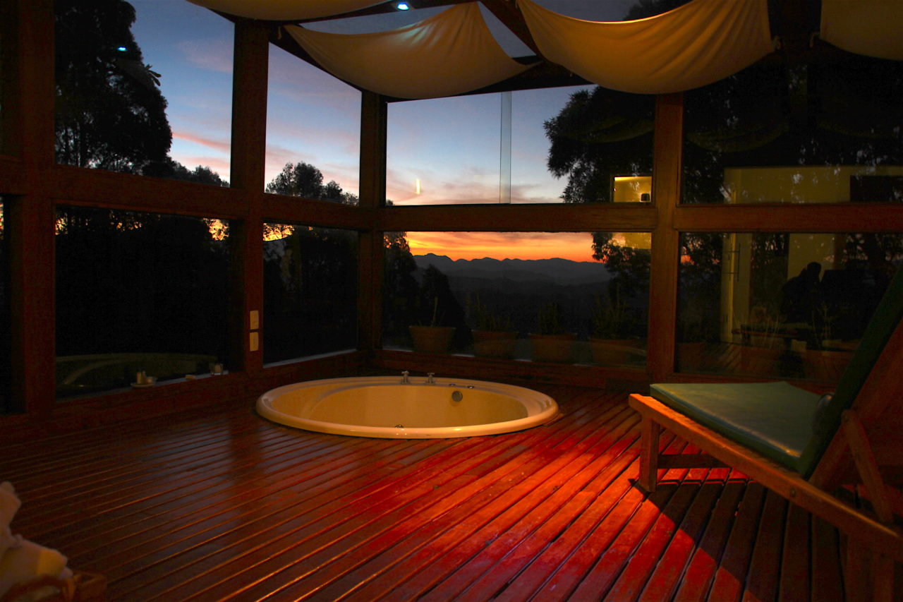 Para nossa imensa satisfação, o quarto com 200 m2, conta com uma enorme sala de banho com teto e paredes de vidro, piso quentinho, jacuzzi com vista das Montanhas e Pedra do Baú, duas lareiras (interna e externa), dois banheiros, duas duchas, duas pias, sauna úmida, terraço, closet, adega e… uma piscina aquecida com borda infinita debruçada sobre a pedra do Baú. Tudo isso só para nós três? Agora pensem nisso tudo decorado com o maior carinho e capricho, com orquídeas em todos os cantos do quarto… Quer mais? Amenities L’occitane para completar nossa mordomia!