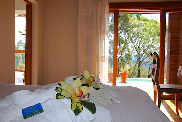 Depois de um drink de boas vindas apreciando a bela paisagem, fomos ao nosso quarto, a Vivenda Eucalipto, que fica em uma localização especial da pousada.