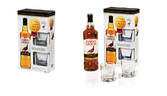 Além da embalagem que foi desenvolvida especialmente para o pack, os dois copos de whisky de vidro são estampados com a logomarca The Famous Grouse Scotland´s favorite whisky (whisky favorito da Escócia).