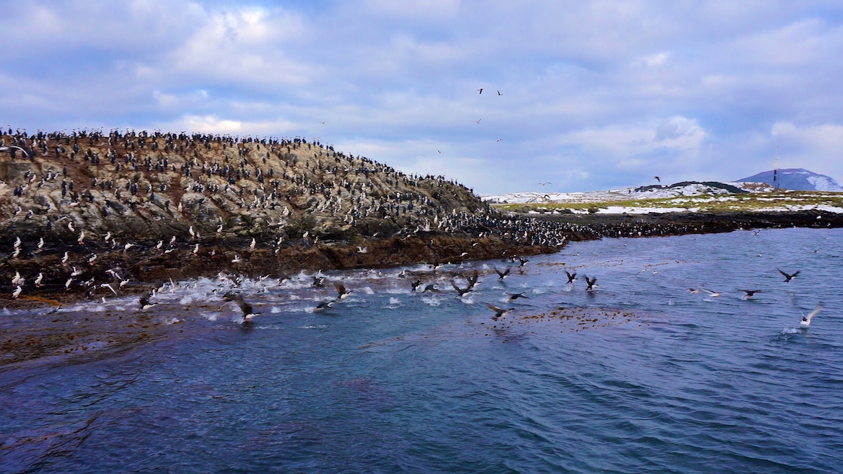 O cenário era incrível, o tempo estava fechado, mas não tirou a beleza da região. Em pouco tempo avistamos uma ilha lotada de comodoros, aves nativas que parecem pinguins.
