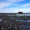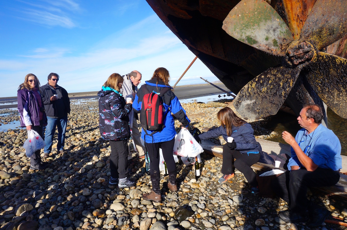 Nossa ideia é era um picnic ao “pés”do navio e para isso precisávamos chegar no auge da maré seca, Amyr logo checou o melhor o horário e avisou a todos. Para o pic nic, empanadas, churros e vinho argentino comprados na padaria de Tolhuim.