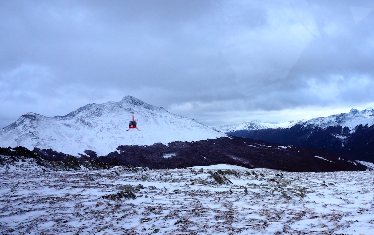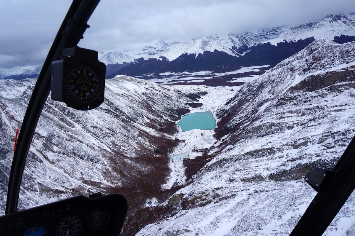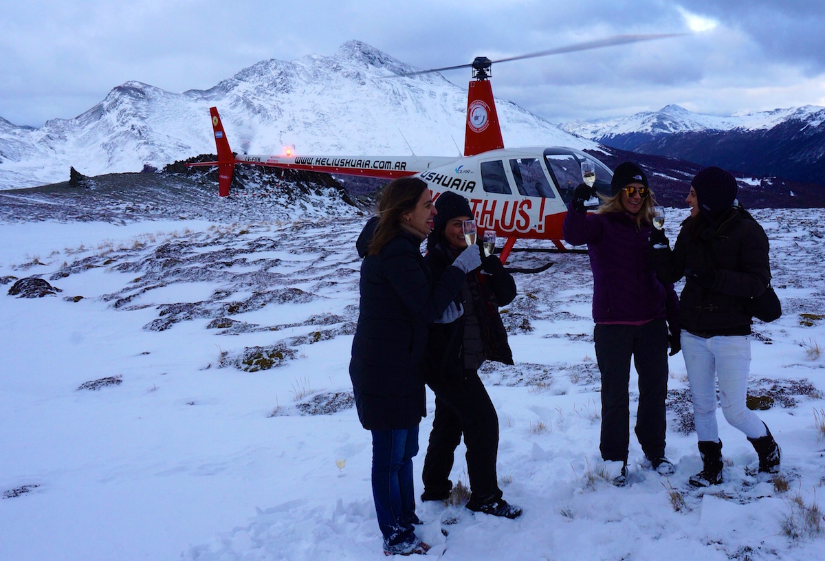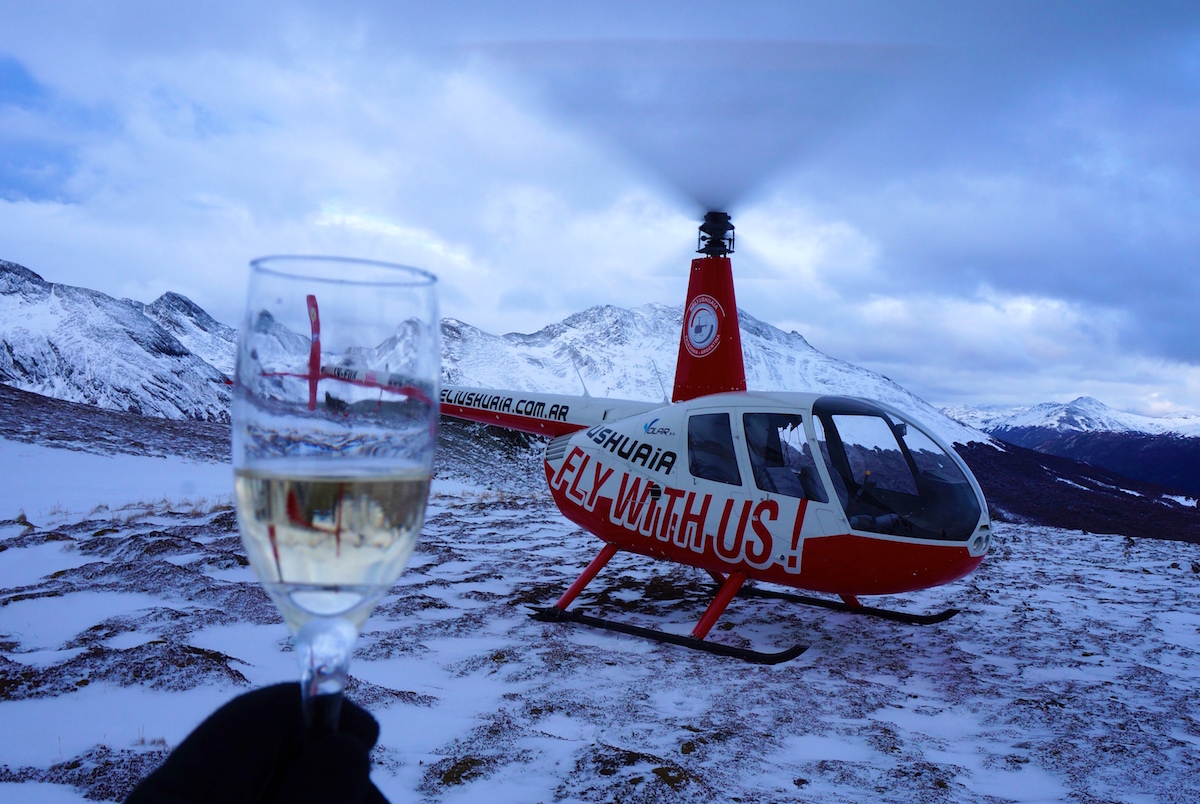 Para finalizar o dia algumas pessoas do grupo junto com a Marina Klink, seguiram para o Heli Ushuaia onde entramos em dois pequenos helicópteros e fizemos um vôo panorâmico pela Cordilheira dos Andes, laguna esmeralda e uma pequena parada no alto da montanha para estourar um espumante e brindar a viagem.